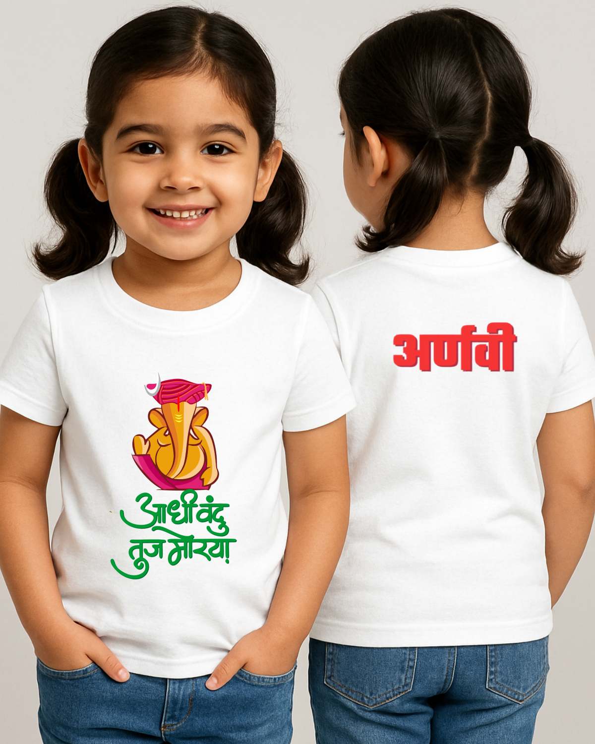 'Aadhi Vandu tuz morya' themed Ganpati t-shirt for kids. Personalize it with your child’s name. Perfect for festive celebrations.