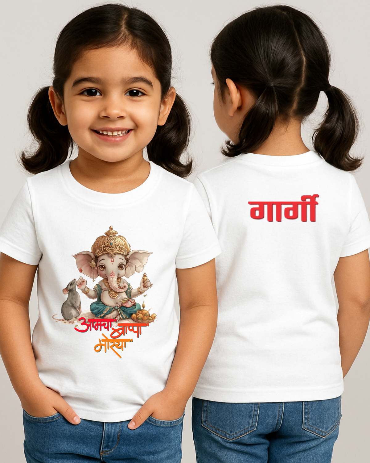 'Aamcha Bappa' themed Ganpati t-shirt for kids. Personalize it with your child’s name. Perfect for festive celebrations.