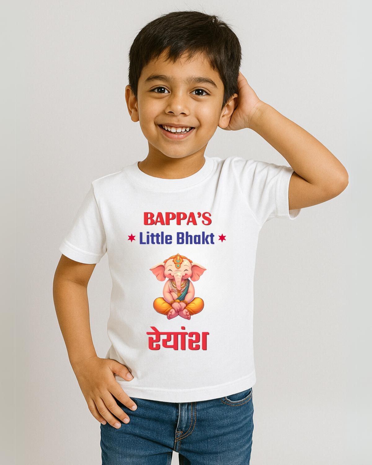 bappa's Little Bhakt' themed Ganpati t-shirt for kids. Personalize it with your child’s name. Perfect for festive celebrations.