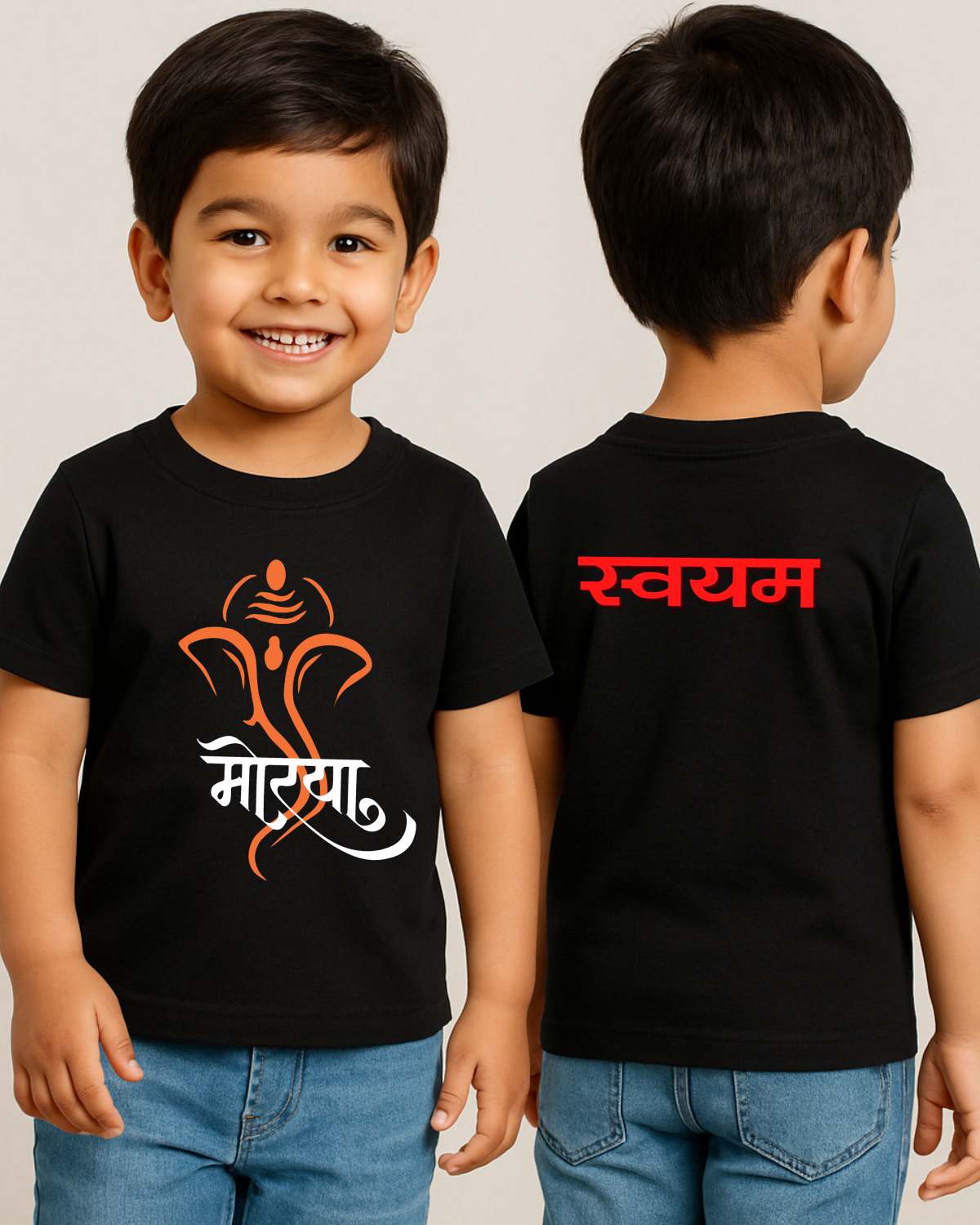 'Morya' themed Ganpati t-shirt for kids. Personalize it with your child’s name. Perfect for festive celebrations.